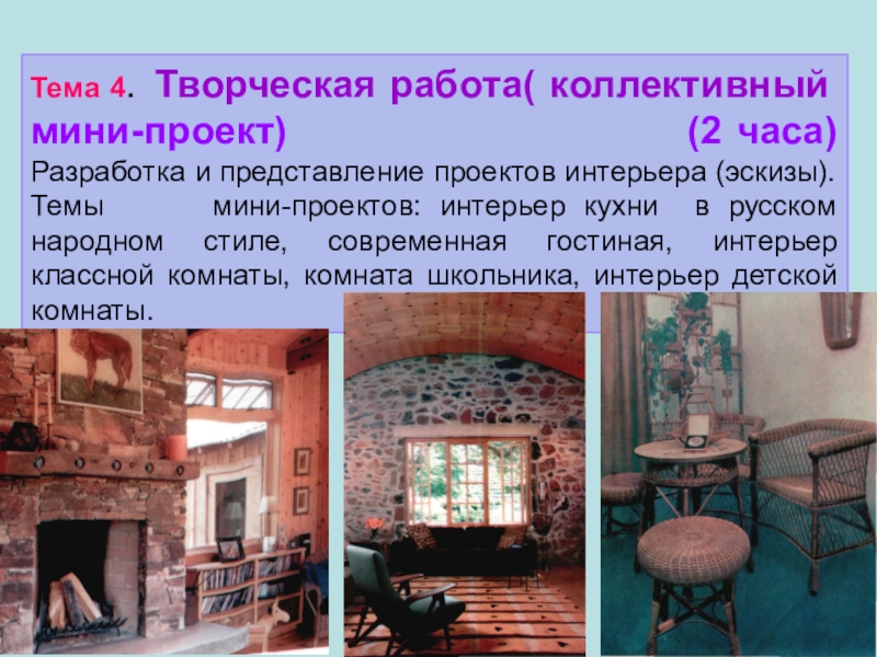 Разработка и представление проектов интерьера (эскизы). Темы мини-проектов: интерьер кухни в русском народном стиле, современная гостиная, интерьер классной комнаты, комната школьника, интерьер детской комнаты.