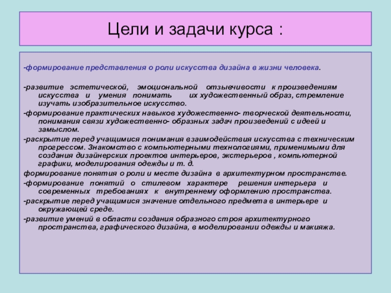 -раскрытие перед учащимися понимания взаимодействия искусства с техническим прогрессом. Знакомство с компьютерными технологиями, применимыми для создания дизайнерских проектов интерьеров, экстерьеров , компьютерной графики, моделирования одежды и т. д.