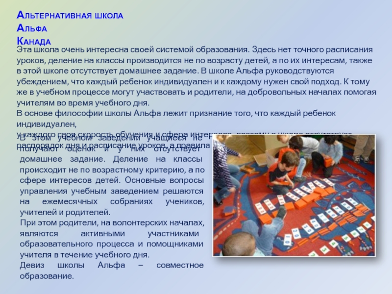 уроков, деление на классы производится не по возрасту детей, а по их интересам, также в этой школе отсутствует домашнее задание. В школе Альфа руководствуются убеждением, что каждый ребенок индивидуален и к каждому нужен свой подход. К тому же в учебном процессе могут участвовать и родители, на добровольных началах помогая учителям во время учебного дня.