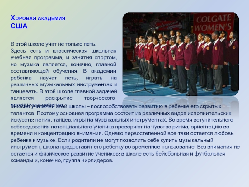 скрытых талантов. Поэтому основная программа состоит из различных видов исполнительских искусств: пения, танцев, игры на музыкальных инструментах. Во время вступительного собеседования потенциального ученика проверяют на чувство ритма, ориентацию во времени и концентрацию внимания. Однако первостепенной все-таки остается любовь ребенка к музыке. Если родители не могут позволить себе купить музыкальный инструмент, школа предоставит его ребенку во временное пользование. Без внимания не остается и физическое развитие учеников: в школе есть бейсбольная и футбольная команды и, конечно, группа чирлидеров.