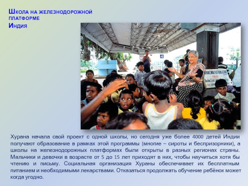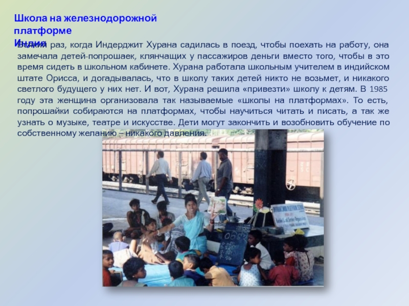 поезд, чтобы поехать на работу, она замечала детей-попрошаек, клянчащих у пассажиров деньги вместо того, чтобы в это время сидеть в школьном кабинете. Хурана работала школьным учителем в индийском штате Орисса, и догадывалась, что в школу таких детей никто не возьмет, и никакого светлого будущего у них нет. И вот, Хурана решила «привезти» школу к детям. В 1985 году эта женщина организовала так называемые «школы на платформах». То есть, попрошайки собираются на платформах, чтобы научиться читать и писать, а так же узнать о музыке, театре и искусстве. Дети могут закончить и возобновить обучение по собственному желанию – никакого давления.