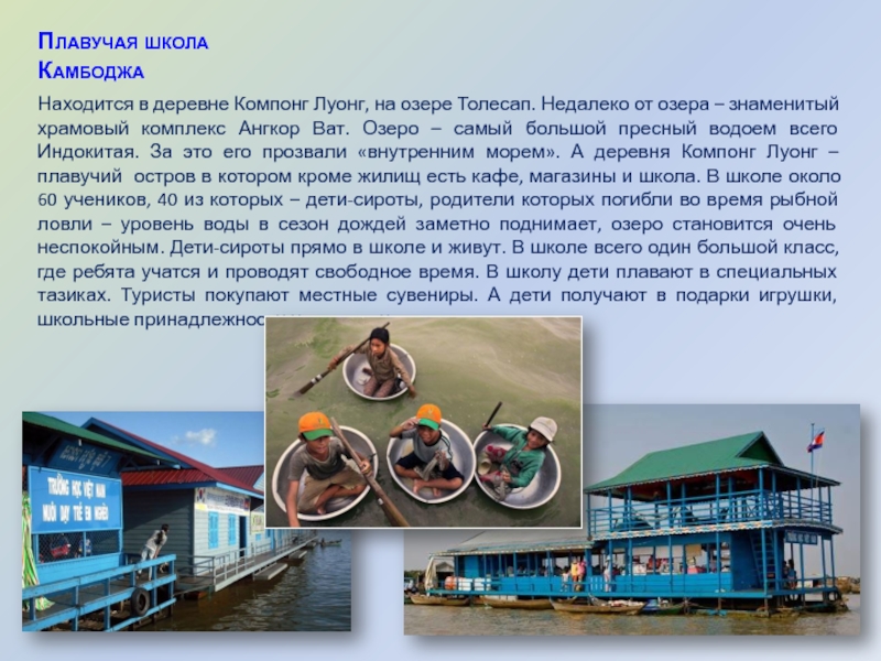 от озера – знаменитый храмовый комплекс Ангкор Ват. Озеро – самый большой пресный водоем всего Индокитая. За это его прозвали «внутренним морем». А деревня Компонг Луонг – плавучий остров в котором кроме жилищ есть кафе, магазины и школа. В школе около 60 учеников, 40 из которых – дети-сироты, родители которых погибли во время рыбной ловли – уровень воды в сезон дождей заметно поднимает, озеро становится очень неспокойным. Дети-сироты прямо в школе и живут. В школе всего один большой класс, где ребята учатся и проводят свободное время. В школу дети плавают в специальных тазиках. Туристы покупают местные сувениры. А дети получают в подарки игрушки, школьные принадлежности и сладости.