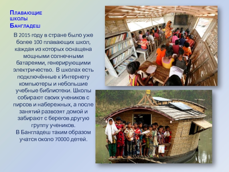 каждая из которых оснащена мощными солнечными батареями, генерирующими электричество. В школах есть подключённые к Интернету компьютеры и небольшие учебные библиотеки. Школы собирают своих учеников с пирсов и набережных, а после занятий развозят домой и забирают с берегов другую группу учеников.
