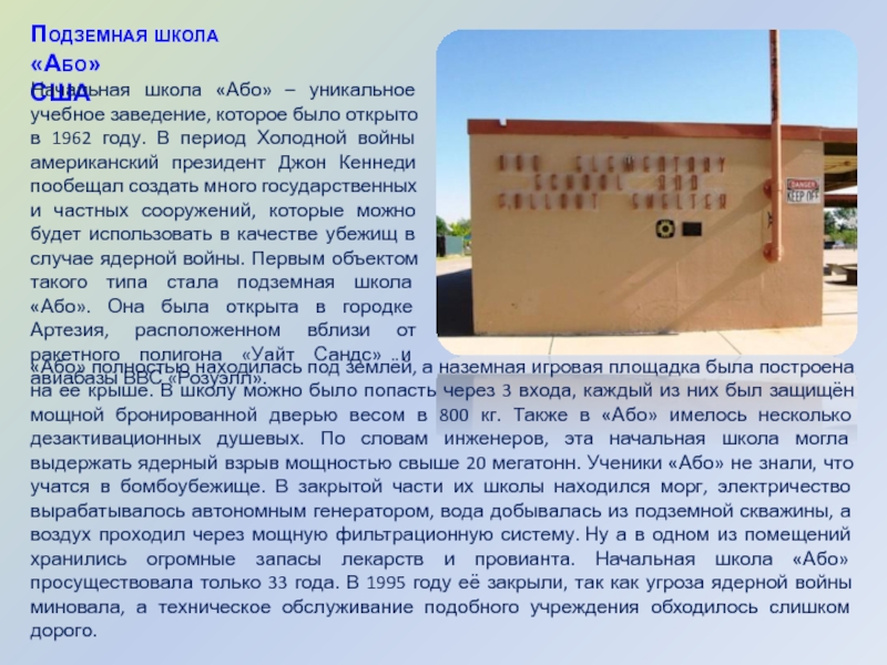 открыто в 1962 году. В период Холодной войны американский президент Джон Кеннеди пообещал создать много государственных и частных сооружений, которые можно будет использовать в качестве убежищ в случае ядерной войны. Первым объектом такого типа стала подземная школа «Або». Она была открыта в городке Артезия, расположенном вблизи от ракетного полигона «Уайт Сандс» и авиабазы ВВС «Розуэлл».