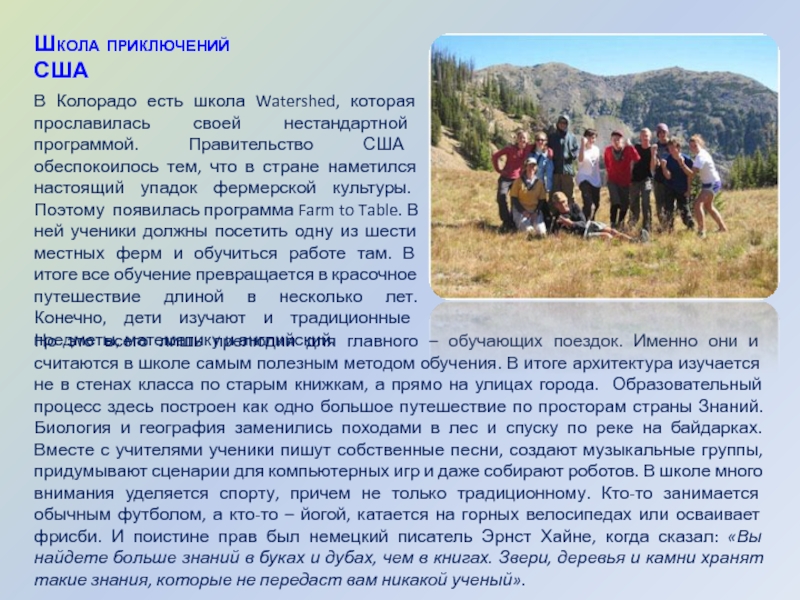 В Колорадо есть школа Watershed, которая прославилась своей нестандартной программой. Правительство США обеспокоилось тем, что в стране наметился настоящий упадок фермерской культуры. Поэтому появилась программа Farm to Table. В ней ученики должны посетить одну из шести местных ферм и обучиться работе там. В итоге все обучение превращается в красочное путешествие длиной в несколько лет. Конечно, дети изучают и традиционные предметы, математику и английский.