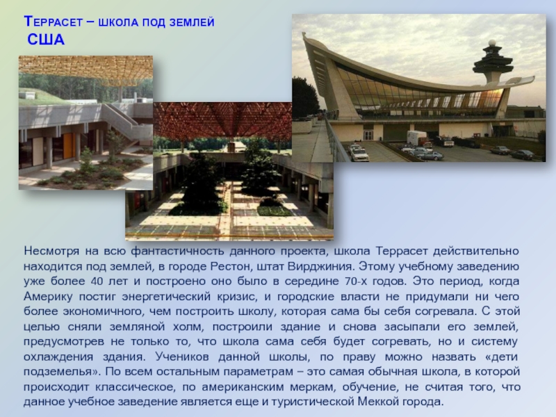школа Террасет действительно находится под землей, в городе Рестон, штат Вирджиния. Этому учебному заведению уже более 40 лет и построено оно было в середине 70-х годов. Это период, когда Америку постиг энергетический кризис, и городские власти не придумали ни чего более экономичного, чем построить школу, которая сама бы себя согревала. С этой целью сняли земляной холм, построили здание и снова засыпали его землей, предусмотрев не только то, что школа сама себя будет согревать, но и систему охлаждения здания. Учеников данной школы, по праву можно назвать «дети подземелья». По всем остальным параметрам – это самая обычная школа, в которой происходит классическое, по американским меркам, обучение, не считая того, что данное учебное заведение является еще и туристической Меккой города.