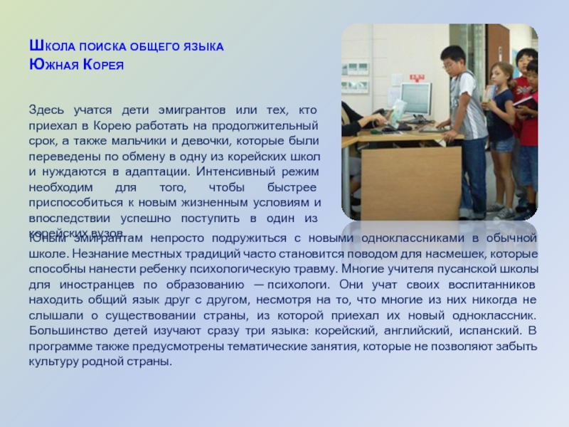 в обычной школе. Незнание местных традиций часто становится поводом для насмешек, которые способны нанести ребенку психологическую травму. Многие учителя пусанской школы для иностранцев по образованию — психологи. Они учат своих воспитанников находить общий язык друг с другом, несмотря на то, что многие из них никогда не слышали о существовании страны, из которой приехал их новый одноклассник. Большинство детей изучают сразу три языка: корейский, английский, испанский. В программе также предусмотрены тематические занятия, которые не позволяют забыть культуру родной страны.