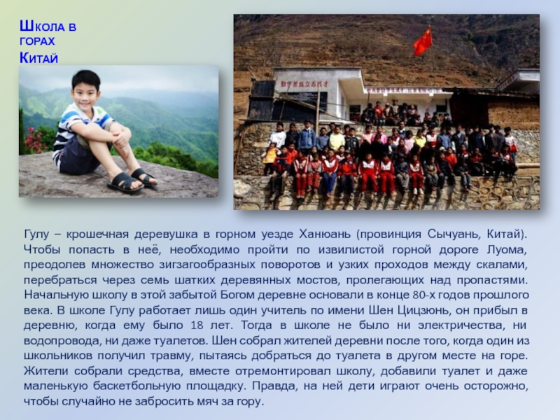 (провинция Сычуань, Китай). Чтобы попасть в неё, необходимо пройти по извилистой горной дороге Луома, преодолев множество зигзагообразных поворотов и узких проходов между скалами, перебраться через семь шатких деревянных мостов, пролегающих над пропастями. Начальную школу в этой забытой Богом деревне основали в конце 80-х годов прошлого века. В школе Гулу работает лишь один учитель по имени Шен Цицзюнь, он прибыл в деревню, когда ему было 18 лет. Тогда в школе не было ни электричества, ни водопровода, ни даже туалетов. Шен собрал жителей деревни после того, когда один из школьников получил травму, пытаясь добраться до туалета в другом месте на горе. Жители собрали средства, вместе отремонтировал школу, добавили туалет и даже маленькую баскетбольную площадку. Правда, на ней дети играют очень осторожно, чтобы случайно не забросить мяч за гору.