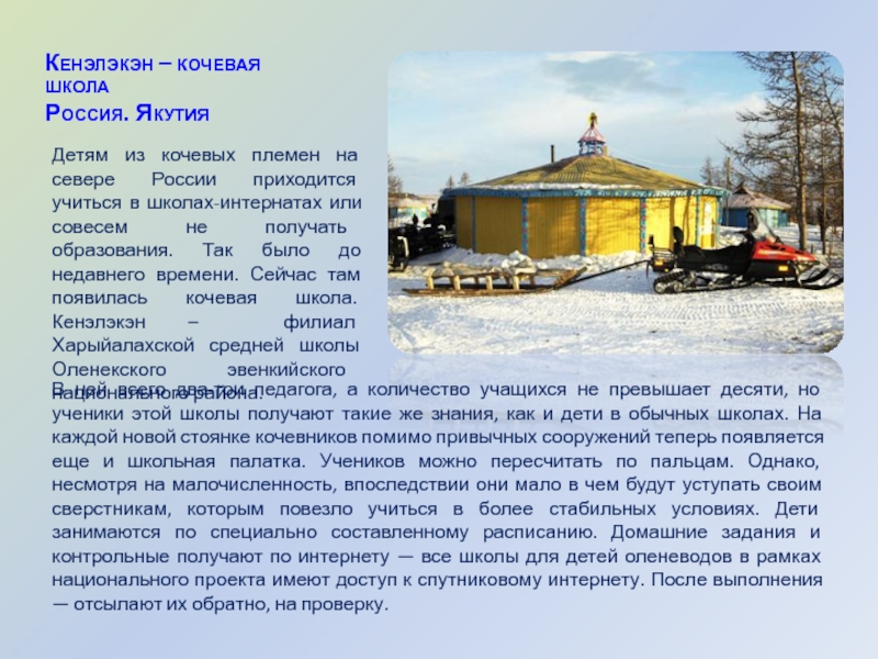 или совесем не получать образования. Так было до недавнего времени. Сейчас там появилась кочевая школа. Кенэлэкэн – филиал Харыйалахской средней школы Оленекского эвенкийского национального района.
