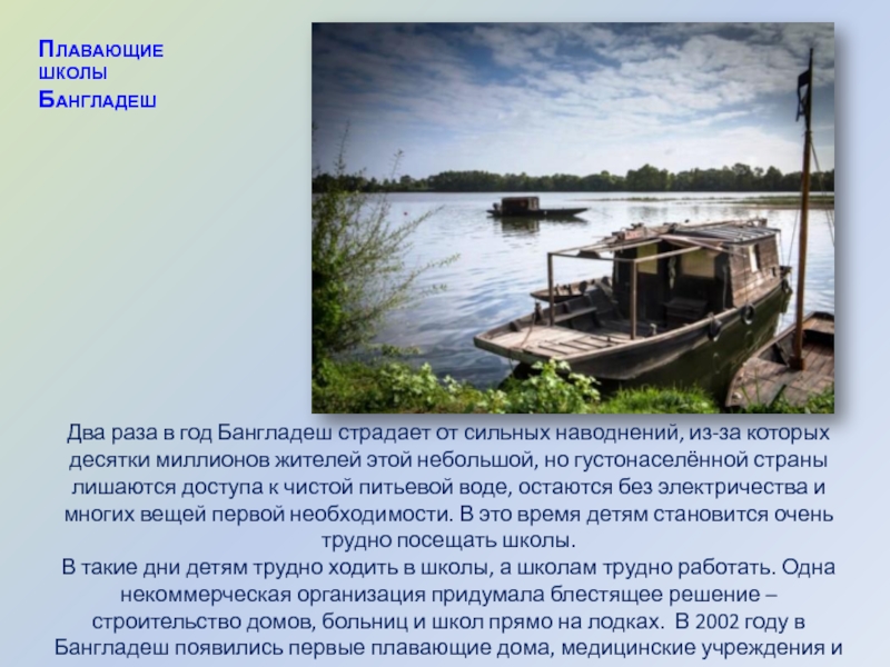 В такие дни детям трудно ходить в школы, а школам трудно работать. Одна некоммерческая организация придумала блестящее решение – строительство домов, больниц и школ прямо на лодках. В 2002 году в Бангладеш появились первые плавающие дома, медицинские учреждения и школы.