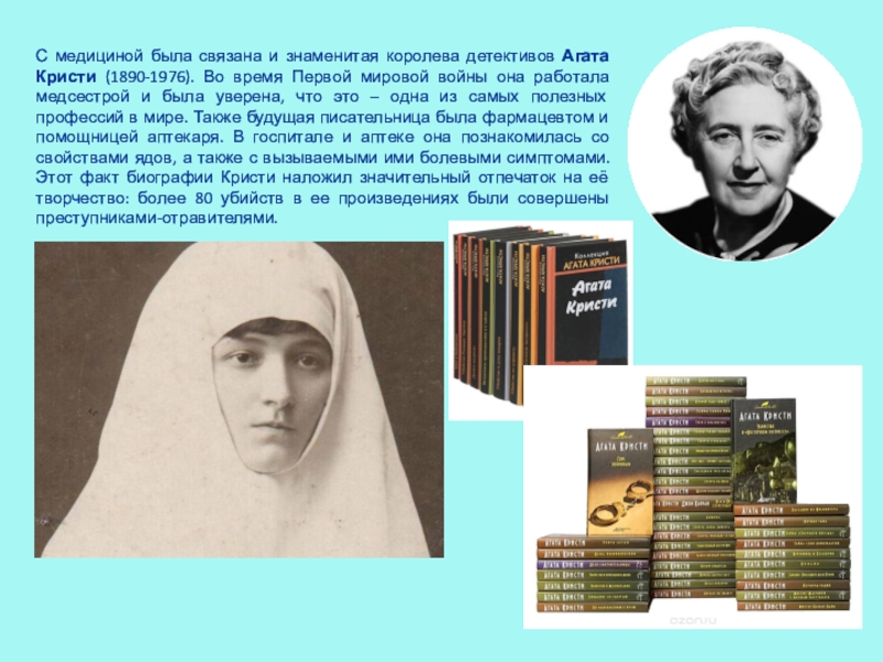 Слайд 26С медициной была связана и знаменитая королева детективов Агата Кристи (1890-1976).