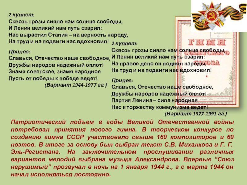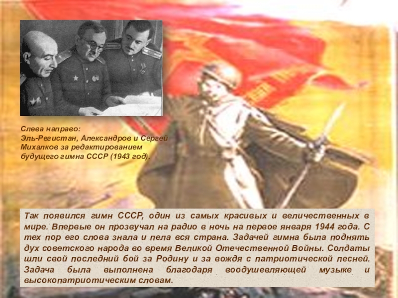 Так появился гимн СССР, один из самых красивых и величественных в мире. Впервые он прозвучал на радио в ночь на первое января 1944 года. С тех пор его слова знала и пела вся страна. Задачей гимна была поднять дух советского народа во время Великой Отечественной Войны. Солдаты шли свой последний бой за Родину и за вождя с патриотической песней. Задача была выполнена благодаря воодушевляющей музыке и высокопатриотическим словам.