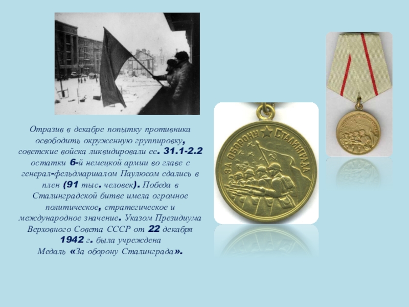Слайд 10Отразив в декабре попытку противника освободить окруженную группировку, советские войска ликвидировали