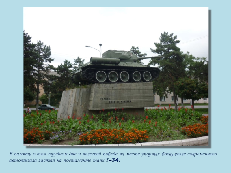 упорных боев, возле современного автовокзала застыл на постаменте танк Т–34.