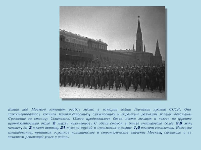 СССР. Она характеризовалась крайней напряженностью, сложностью и огромным размахом боевых действий. Сражение за столицу Советского Союза продолжалось более шести месяцев и велось на фронте протяженностью около 2 тысяч километров. С обеих сторон в битве участвовало более 2,8 млн. человек, до 2 тысяч танков, 21 тысяча орудий и минометов и свыше 1,6 тысячи самолетов. Немецкое командование, признавая огромное политическое и стратегическое значение Москвы, связывало с ее захватом решающий успех в войне.