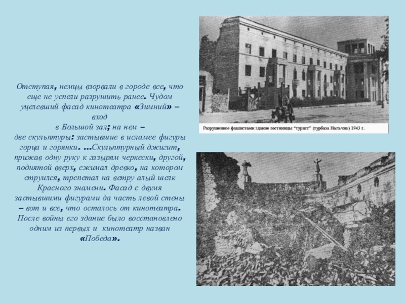 две скульптуры: застывшие в исламее фигуры горца и горянки. ...Скульптурный джигит, прижав одну руку к газырям черкески, другой, поднятой вверх, сжимал древко, на котором струился, трепетал на ветру алый шелк Красного знамени. Фасад с двумя застывшими фигурами да часть левой стены – вот и все, что осталось от кинотеатра.