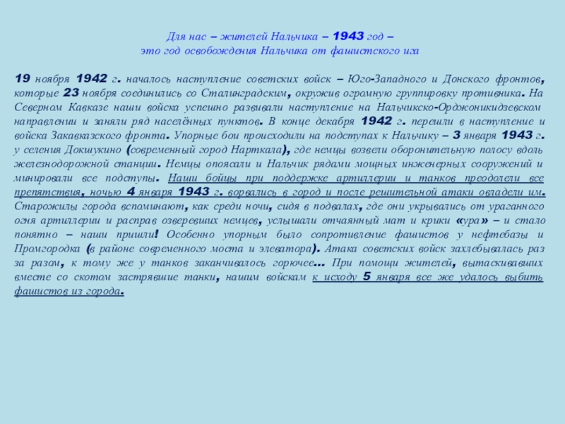 Слайд 11Для нас – жителей Нальчика – 1943 год –