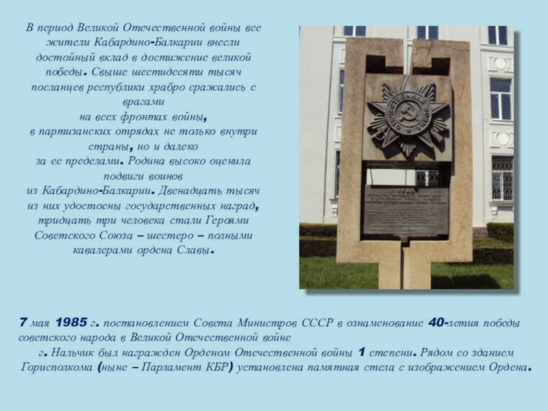 г. Нальчик был награжден Орденом Отечественной войны 1 степени. Рядом со зданием Горисполкома (ныне – Парламент КБР) установлена памятная стела с изображением Ордена.