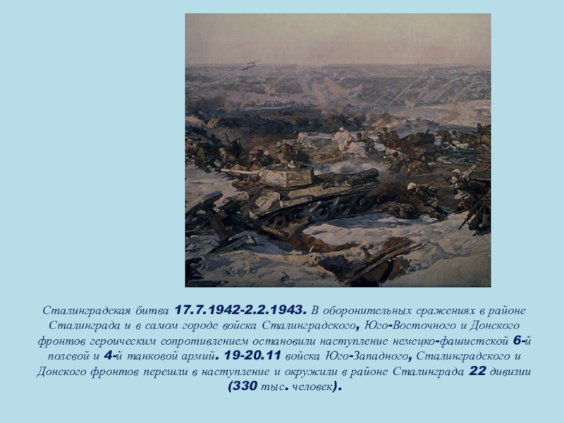 самом городе войска Сталинградского, Юго-Восточного и Донского фронтов героическим сопротивлением остановили наступление немецко-фашистской 6-й полевой и 4-й танковой армий. 19-20.11 войска Юго-Западного, Сталинградского и Донского фронтов перешли в наступление и окружили в районе Сталинграда 22 дивизии (330 тыс. человек).