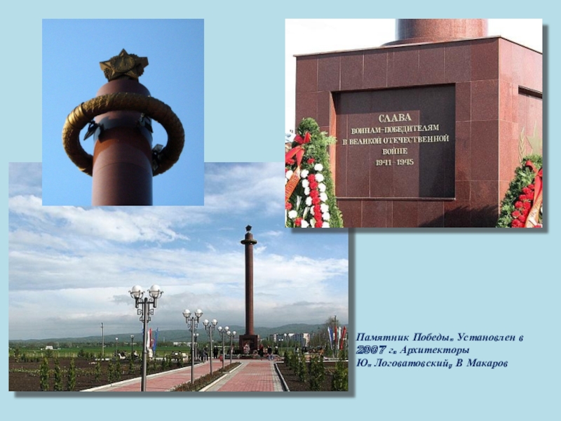 Слайд 20Памятник Победы. Установлен в 2007 г. Архитекторы