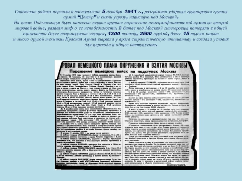 Слайд 5Советские войска перешли в наступление 5 декабря 1941 г., разгромили ударные