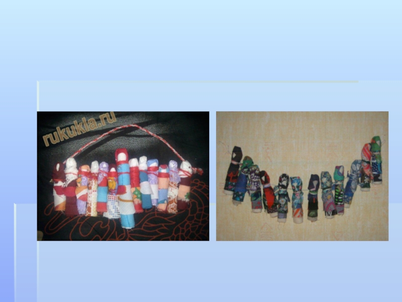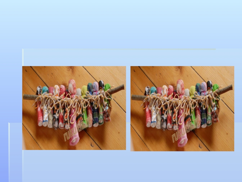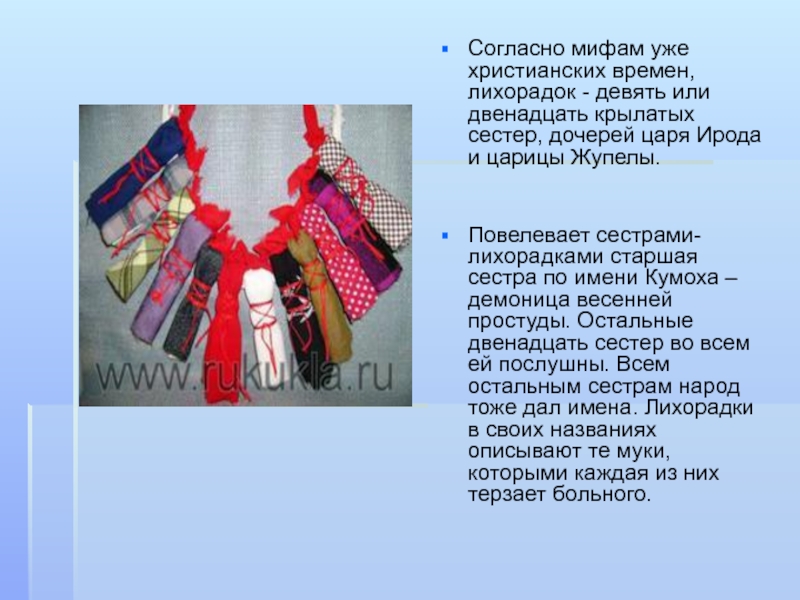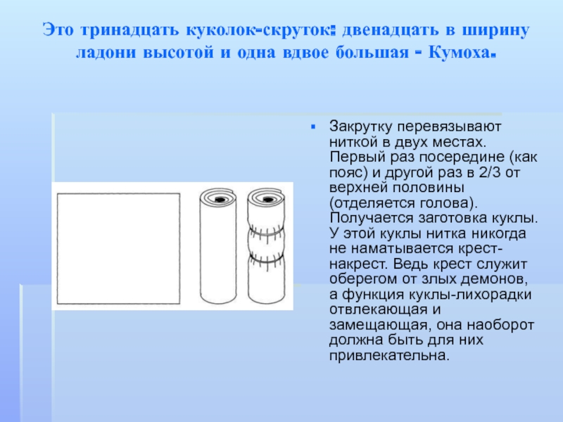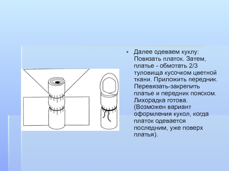 Закрутку перевязывают ниткой в двух местах. Первый раз посередине (как пояс) и другой раз в 2/3 от верхней половины (отделяется голова). Получается заготовка куклы. У этой куклы нитка никогда не наматывается крест-накрест. Ведь крест служит оберегом от злых демонов, а функция куклы-лихорадки отвлекающая и замещающая, она наоборот должна быть для них привлекательна.