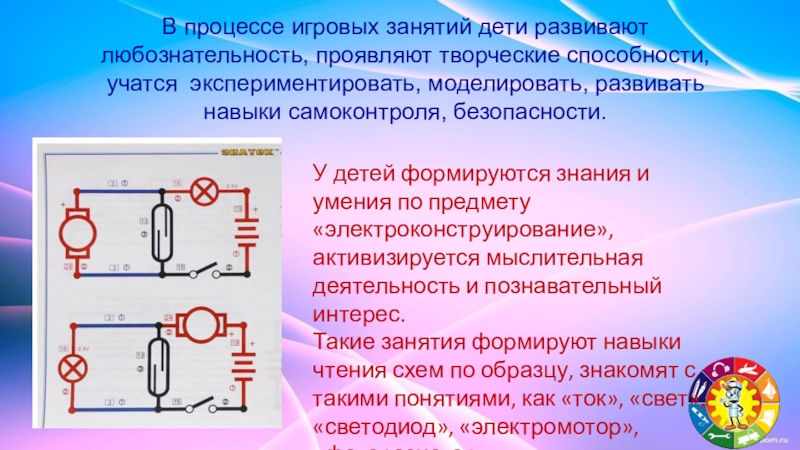 Такие занятия формируют навыки чтения схем по образцу, знакомят с такими понятиями, как «ток», «свет», «светодиод», «электромотор», «фоторезистор».