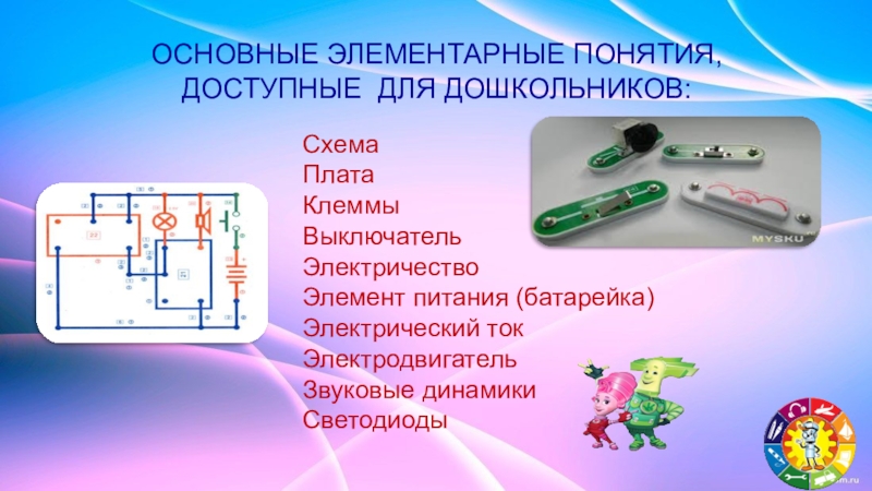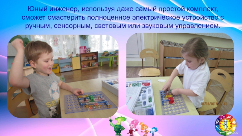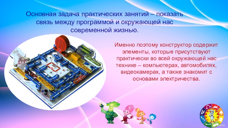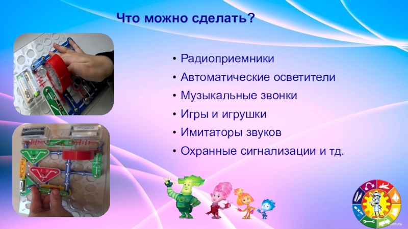 Именно поэтому конструктор содержит элементы, которые присутствуют практически во всей окружающей нас технике – компьютерах, автомобилях, видеокамерах, а также знакомит с основами электричества.