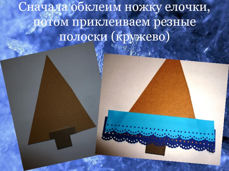 Слайд 4Сначала обклеим ножку елочки, потом приклеиваем резные полоски (кружево)