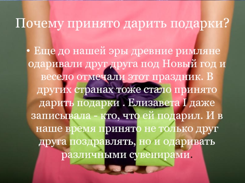 Почему принято дарить подарки?Еще до нашей эры древние римляне одаривали друг друга под Новый год и весело отмечали этот праздник. В других странах тоже стало принято дарить подарки . Елизавета I даже записывала - кто, что