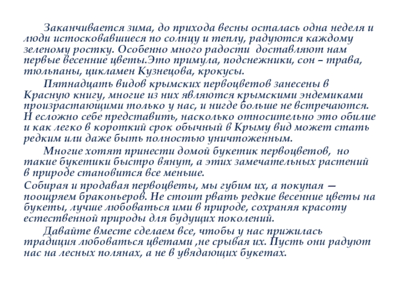 Заканчивается зима, до прихода весны осталась одна неделя и люди истосковавшиеся по солнцу и теплу, радуются каждому зеленому ростку. Особенно много радости доставляют нам первые весенние цветы.Это примула, подснежники, сон – трава, тюльпаны, цикламен Кузнецова, крокусы. Пятнадцать