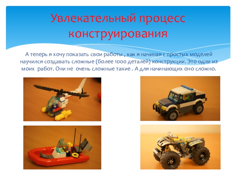Здесь есть и гоночные джипы, и машины, которые выполняет самую тяжелую работу в реальном мире: бульдозеры, самосвалы, внедорожные тягачи, краны, манипуляторы, буксировщики, самолеты, погрузчики, тракторы и многое другое.