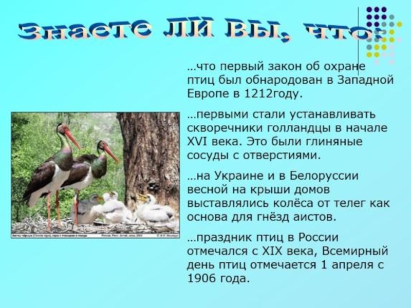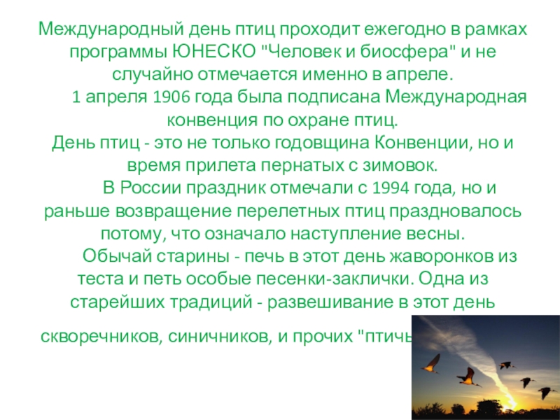 биосфера" и не случайно отмечается именно в апреле.             1 апреля 1906 года была подписана Международная конвенция по охране птиц.  День птиц - это не только годовщина Конвенции, но и время прилета пернатых с зимовок.         В России праздник отмечали с 1994 года, но и раньше возвращение перелетных птиц праздновалось потому, что означало наступление весны.         Обычай старины - печь в этот день жаворонков из теста и петь особые песенки-заклички. Одна из старейших традиций - развешивание в этот день скворечников, синичников, и прочих "птичьих домиков".