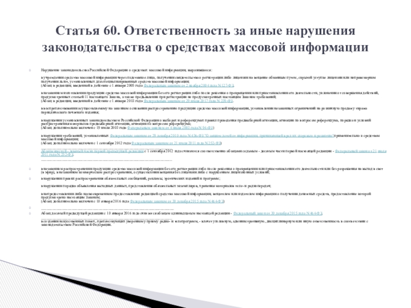 Статья 60. Ответственность за иные нарушения законодательства о средствах массовой информации