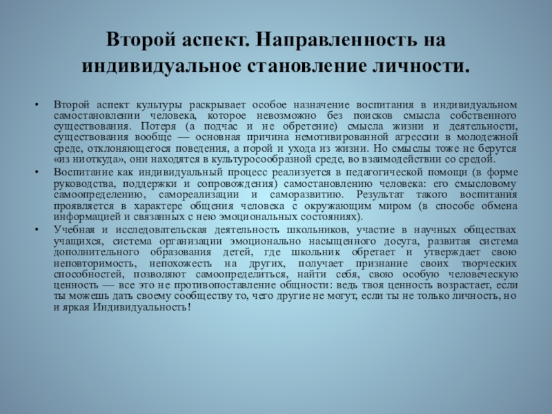 Слайд 4Второй аспект. Направленность на индивидуальное становление личности.