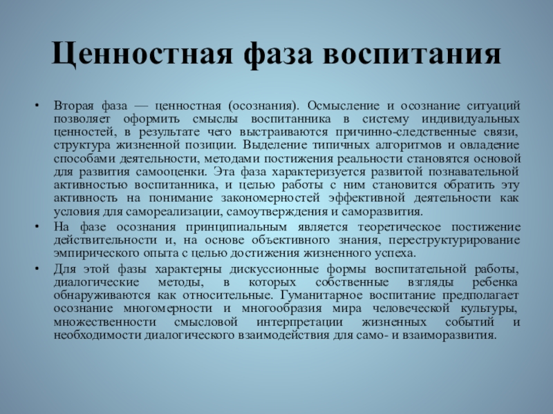 Для этой фазы характерны дискуссионные формы воспитательной работы, диалогические методы, в которых собственные взгляды ребенка обнаруживаются как относительные. Гуманитарное воспитание предполагает осознание многомерности и многообразия мира человеческой культуры, множественности смысловой интерпретации жизненных событий и необходимости диалогического взаимодействия для само- и взаиморазвития.
