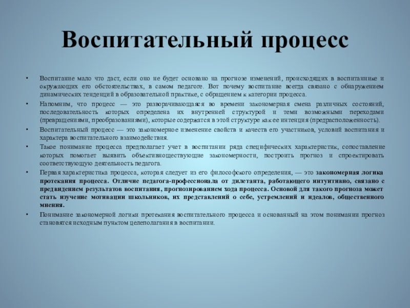 Воспитательный процесс — это закономерное изменение свойств и качеств его участников, условий воспитания и характера воспитательного взаимодействия.