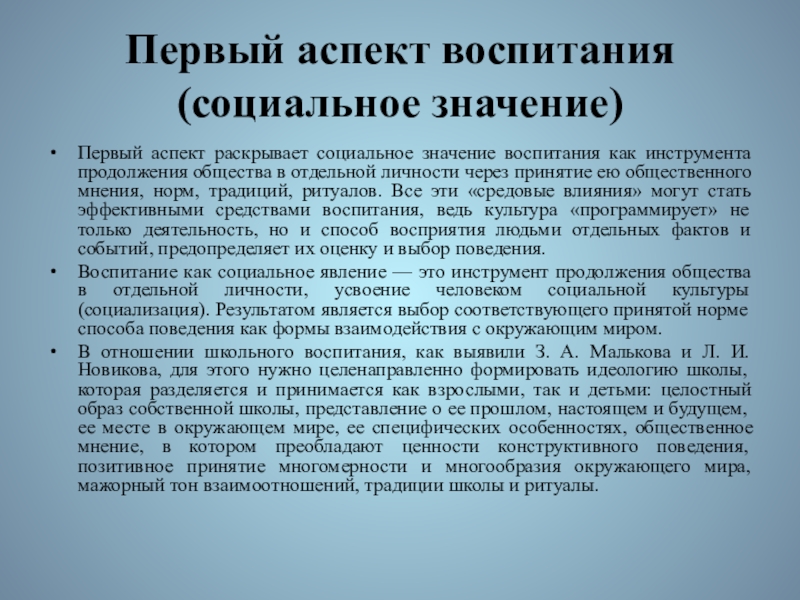 В отношении школьного воспитания, как выявили З. А. Малькова и Л. И. Новикова, для этого нужно целенаправленно формировать идеологию школы, которая разделяется и принимается как взрослыми, так и детьми: целостный образ собственной школы, представление о ее прошлом, настоящем и будущем, ее месте в окружающем мире, ее специфических особенностях, общественное мнение, в котором преобладают ценности конструктивного поведения, позитивное принятие многомерности и многообразия окружающего мира, мажорный тон взаимоотношений, традиции школы и ритуалы.