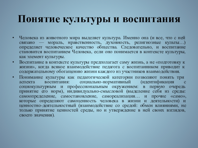 Понимание культуры как педагогической категории позволяют понять три аспекта воспитания: социально-нормативный (идентификация с социокультурным и профессиональным окружением: в первую очередь принятие его норм), индивидуально-смысловой (выделение себя из среды: самоопределение, самостановление, самореализация… и прочие «само», которые определяют самоценность человека в жизни и деятельности) и ценностно-деятельностный (взаимодействие со средой: обмен влияниями, не только принятие ценностей среды, но и утверждение в ней своих взглядов, своего значения).