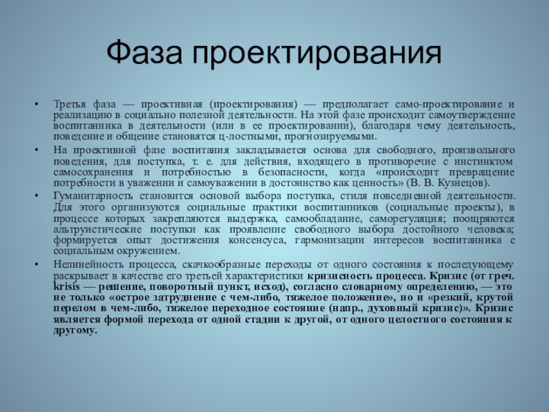 На проективной фазе воспитания закладывается основа для свободного, произвольного поведения, для поступка, т. е. для действия, входящего в противоречие с инстинктом самосохранения и потребностью в безопасности, когда «происходит превращение потребности в уважении и самоуважении в достоинство как ценность» (В. В. Кузнецов).