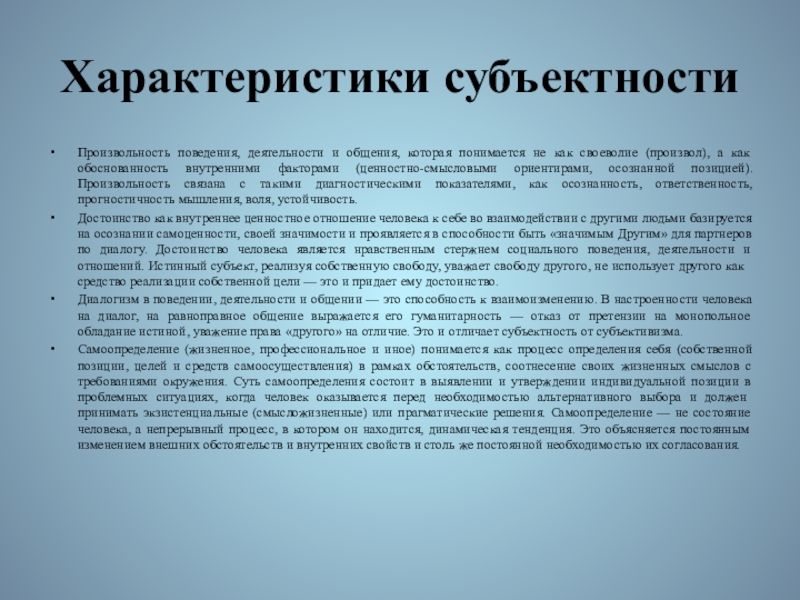 Диалогизм в поведении, деятельности и общении — это способность к взаимоизменению. В настроенности человека на диалог, на равноправное общение выражается его гуманитарность — отказ от претензии на монопольное обладание истиной, уважение права «другого» на отличие. Это и отличает субъектность от субъективизма.