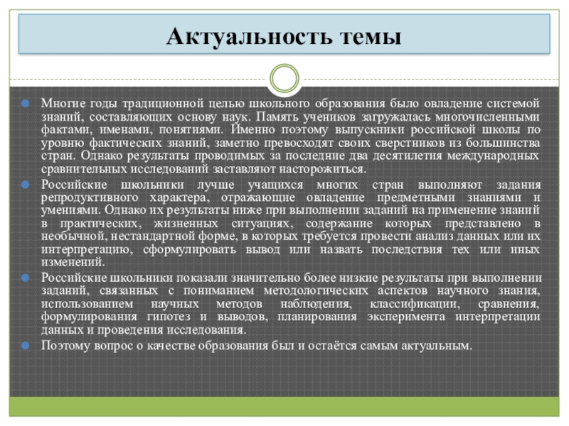 составляющих основу наук. Память учеников загружалась многочисленными фактами, именами, понятиями. Именно поэтому выпускники российской школы по уровню фактических знаний, заметно превосходят своих сверстников из большинства стран. Однако результаты проводимых за последние два десятилетия международных сравнительных исследований заставляют насторожиться.