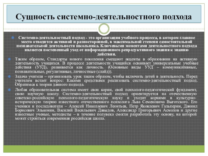 Любая образовательная система имеет свои корни, свой психолого-педагогический фундамент, свою научную школу. Системно-деятельностный подход ориентируется на отечественную советско-российскую психолого-педагогическую науку и уходит корнями в культурно-историческую теорию известного отечественного психолога Льва Семеновича Выготского. Его ученики и последователи – Алексей Николаевич Леонтьев, Петр Яковлевич Гальперин, Даниил Борисович Эльконин, Василий Васильевич Давыдов, Александр Григорьевич Асмолов и другие известные ученые, методисты – в течение полувека смогли разработать эту основу, на которой может строиться современная российская школа.
