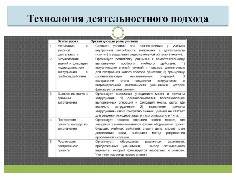 главное место отводится активной и разносторонней, в максимальной степени самостоятельной познавательной деятельности школьника. Ключевыми моментами деятельностного подхода является постепенный уход от информационного репродуктивного знания к знанию действия.
