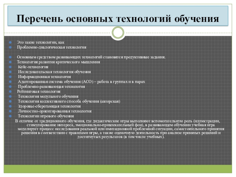 В отличие от традиционного обучения, где дидактические игры выполняют вспомогательную роль (иллюстрации, стимулирование интереса, эмоционально-привлекательный фон), в развивающем обучении учебная игра моделирует процесс исследования реальной или имитационной проблемной ситуации, самостоятельного принятия решения в соответствии с правилами игры, а также оценочную деятельность при анализе принятых решений и достигнутых результатов (в том числе учебных).