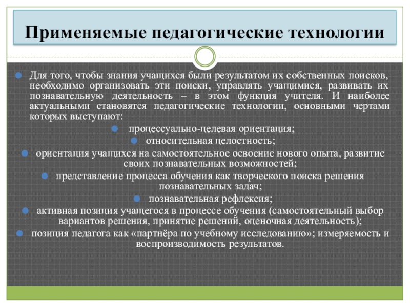 позиция педагога как «партнёра по учебному исследованию»; измеряемость и воспроизводимость результатов.