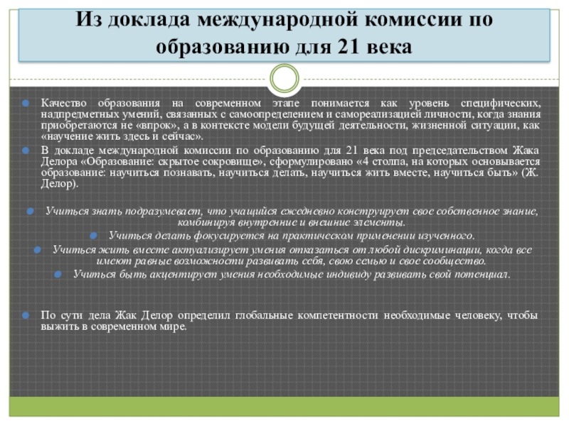В докладе международной комиссии по образованию для 21 века под председательством Жака Делора «Образование: скрытое сокровище», сформулировано «4 столпа, на которых основывается образование: научиться познавать, научиться делать, научиться жить вместе, научиться быть» (Ж. Делор).
