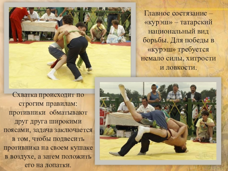 Схватка происходит по строгим правилам: противники обматывают друг друга широкими поясами, задача заключается в том, чтобы подвесить противника на своем кушаке в воздухе, а затем положить его на лопатки.