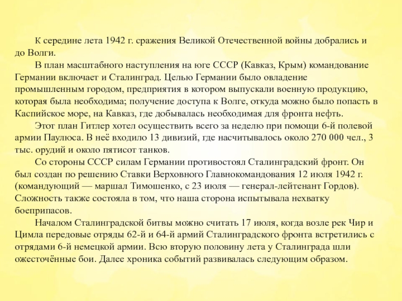 В план масштабного наступления на юге СССР (Кавказ, Крым) командование Германии включает и Сталинград. Целью Германии было овладение промышленным городом, предприятия в котором выпускали военную продукцию, которая была необходима; получение доступа к Волге, откуда можно было попасть в Каспийское море, на Кавказ, где добывалась необходимая для фронта нефть.