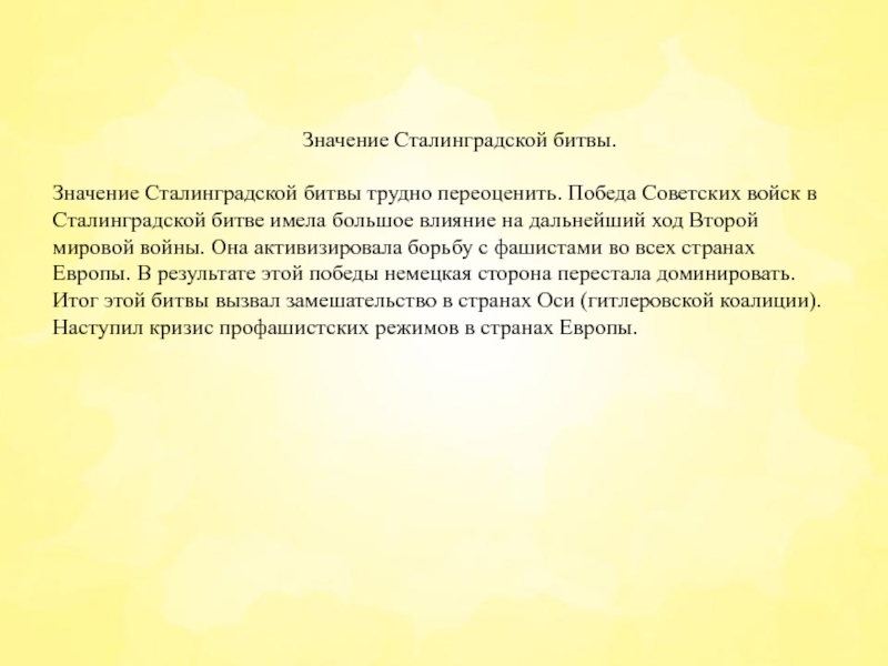 Значение Сталинградской битвы трудно переоценить. Победа Советских войск в Сталинградской битве имела большое влияние на дальнейший ход Второй мировой войны. Она активизировала борьбу с фашистами во всех странах Европы. В результате этой победы немецкая сторона перестала доминировать. Итог этой битвы вызвал замешательство в странах Оси (гитлеровской коалиции). Наступил кризис профашистских режимов в странах Европы.